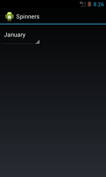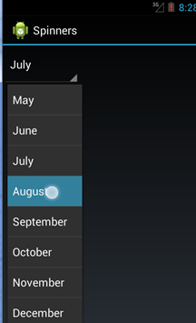 Spinners provide a quick way to select one value from a set. In the default state, a spinner shows its currently selected value. Touching the spinner displays a drop-down menu with all other available values, from which the user can select a new one.